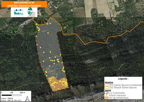 Comme présenté ci-dessous, 72 arbres ont été marqués sur la propriété et un ilôt de sénescence de deux hectares a été défini. Dans cette zone, aucune coupe ne pourra être réalisée sur toute la durée du contrat.