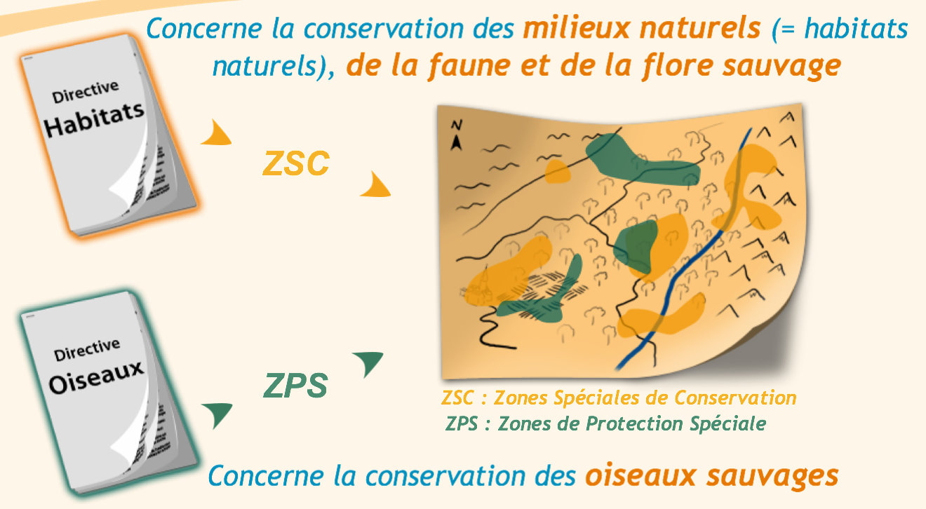 La Directive « Habitats » conduit à la création de Zones spéciale de conservation (ZSC) et la Directive « Oiseaux » à des Zones de protection spéciale (ZPS).